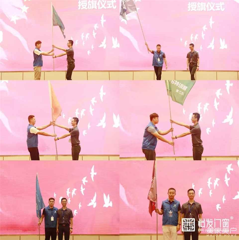 随着音乐响起,授旗仪式正式开始。陈总将旗子授予市场部黄总,接着黄总把旗子授给每一位队长。队长拿到旗子后摇旗招示队员,每位学员都展露出饱满的精神和昂扬的斗志。