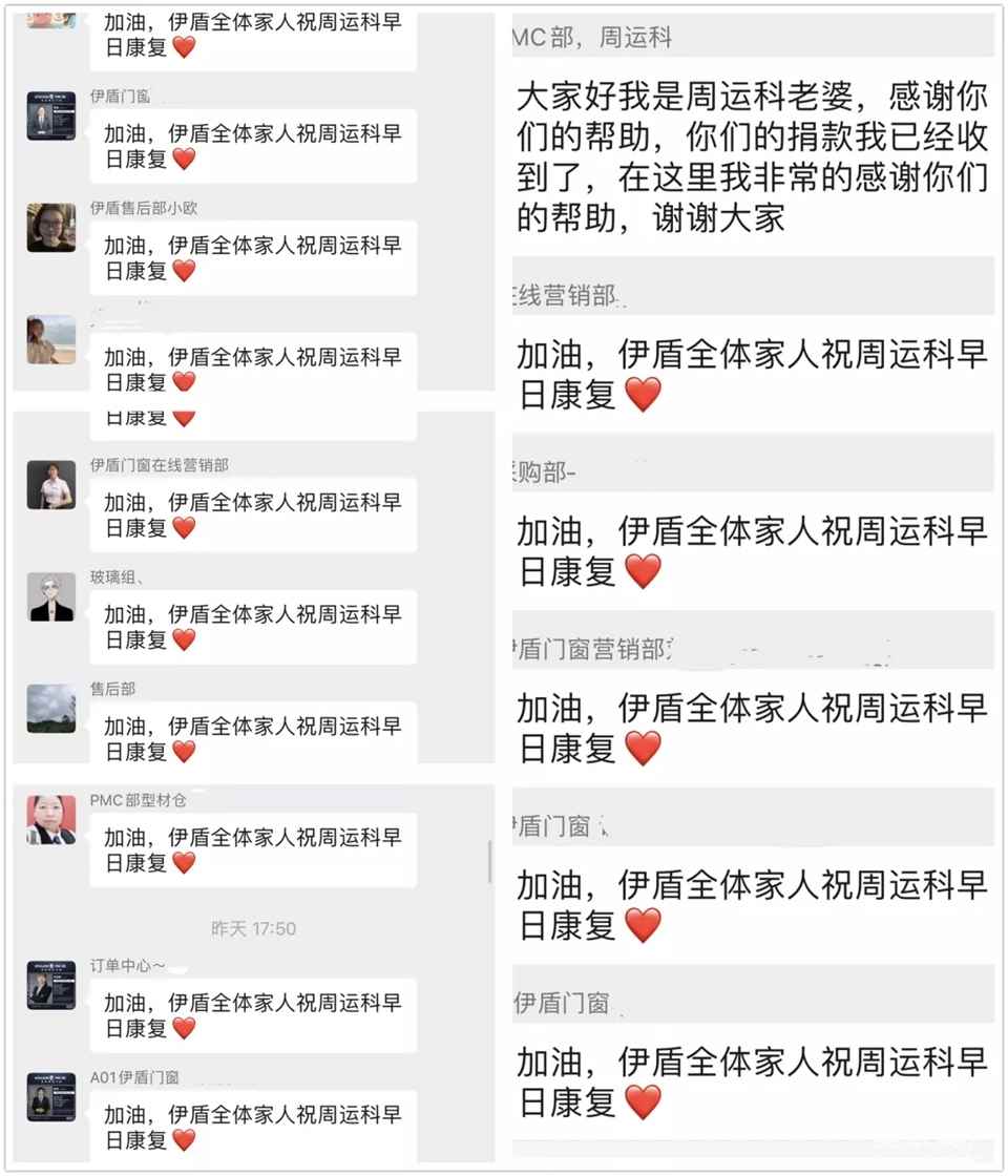 2020年9月10日,总部PMC部老员工周运科不幸身患重病,当晚便被送进了ICU重症病房,如今依然昏迷未醒,每日昂贵的救治费用让这位老党员的家庭难以负荷。为此,在伊盾党支部的倡导之下,伊盾门窗总部决定发起这场爱心传递募捐活动,意在集合全体员工的力量,帮助周运科渡过难关!