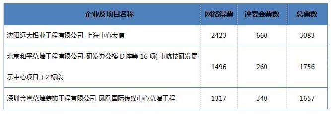 组委会本着公平公正的原则,对参选企业进行层层筛选,通过13位专家评审组参与初评、大众网络投票及评委会委员投票阶段,为期两个半月的激烈角逐后,组委会共收到有效投票共计316532票(其中网络投票257072票,38位评委会委员投票共计59460票),再一次掀起了整个门窗幕墙行业评选的热潮。最终本次评选在274个入围奖项中共有20个品牌、10家企业、30项创新产品、6项工程及30位人物从中脱颖而出。
