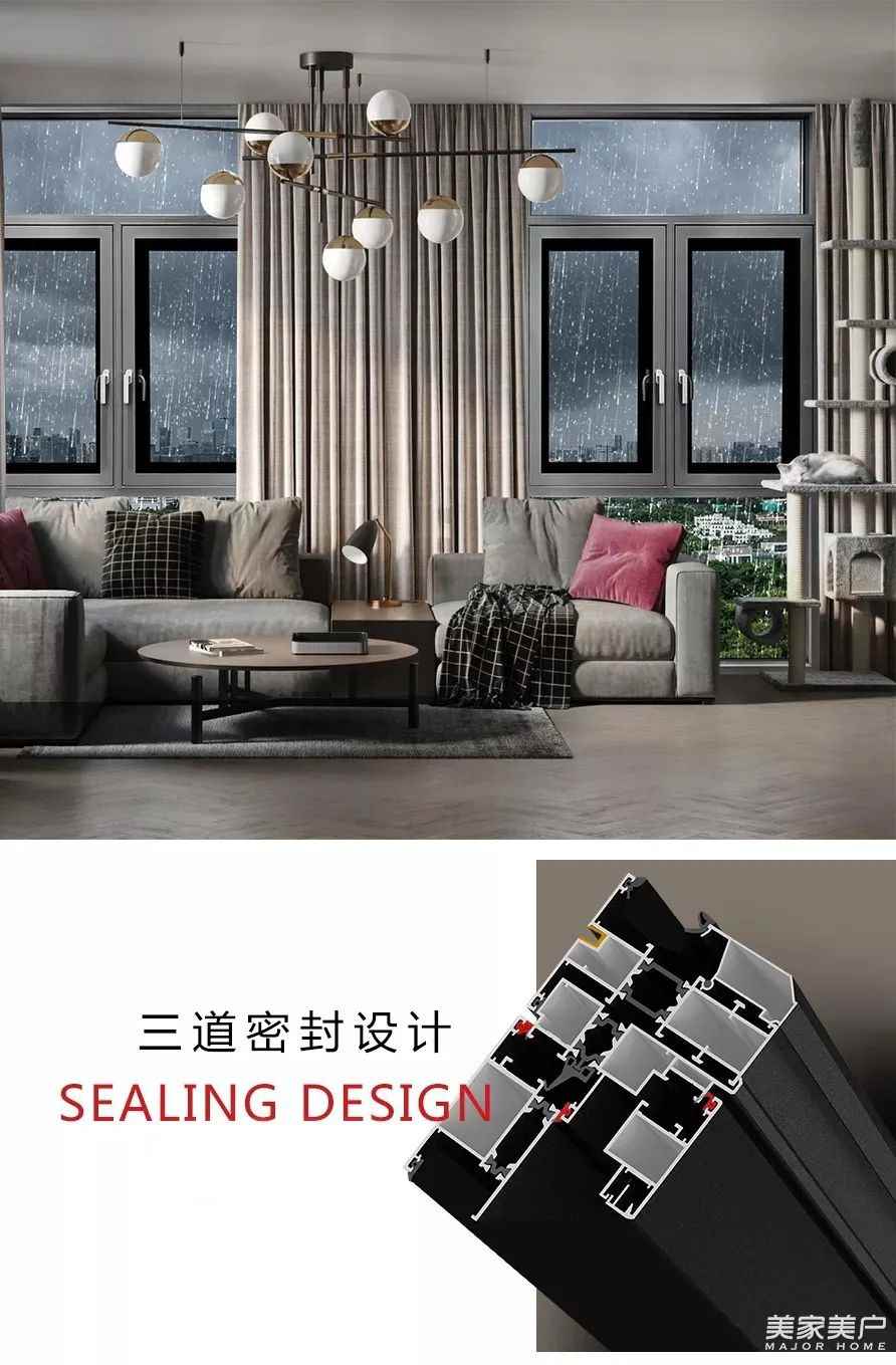 门窗锁闭后,锁点和锁座牢扣在一起,配合进口五金铰链,共同产生强大的密封力,使密封条弹性变形,从而提供给窗户足够的密封性能。