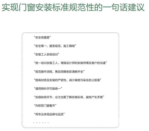 针对如何实现门窗安装标准规范性,关键词top4是“安全”、“培训”、“统一”、“专业”。如从流程规范角度出发的“服务规范”“培训安装工人”“规范化操作流程”;从材质角度出发希望统一安装物料,提高材质严密性;从沟通角度,希望业主也可以同步了解安装流程,从而减少矛盾;众多参与调研者希望,其他门窗企业可以和欧哲一起,推动门窗行业安装交付规范化、标准化。