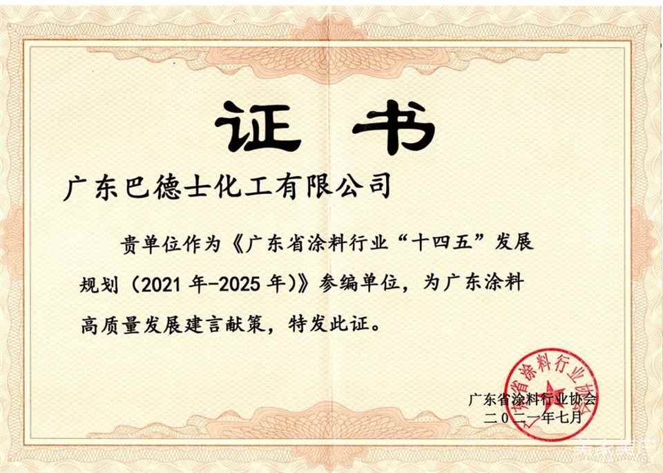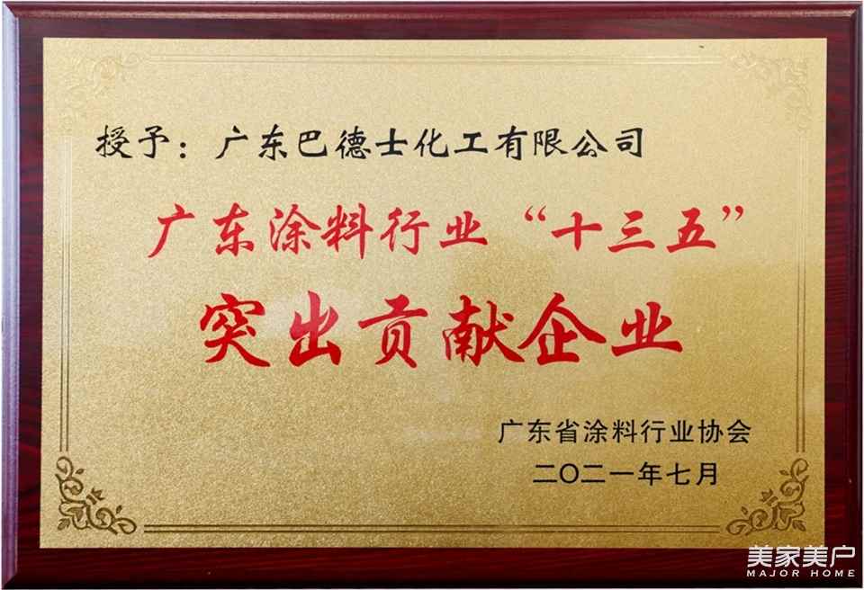 同时,广东省涂料行业协会在《关于表彰广东涂料行业“十三五”突出贡献企业的决定》中表示,“十三五”期间,在国家政策引领和全行业共同努力下,广东涂料产业快速发展,已成为全国涂料行业增长最快的区域之一,高质量完成所制定的各项任务指标。其中广东巴德士化工有限公司等企业的主要经济指标超过行业平均水平,并在品牌建设、科研成果、基地建设、人才建设、平台建设、环保治理、智能制造等方面取得了重大突破,为广东涂料高质量发展做出了突出贡献。