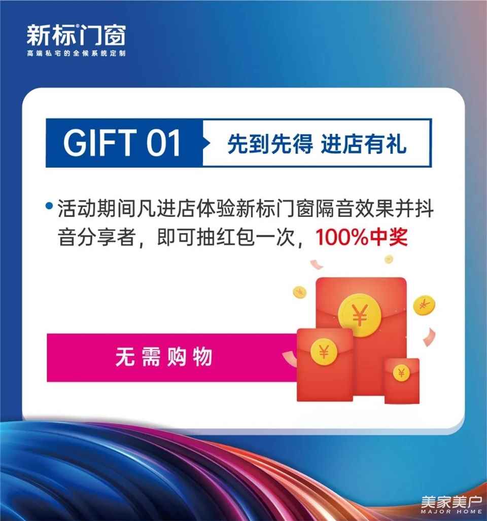 进店有礼进店有礼,先到先得!活动期间,只要进入新标门店,体验门窗产品极致的隔音效果,并分享到抖音@新标门窗SIMBOR,即可参与100%中奖的红包抽奖!