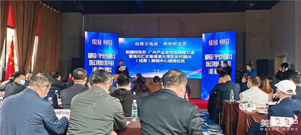 12月21日,新疆阿克苏-广东广州产业合作招商推介会在广州市举行。来自新疆阿克苏的嘉宾,带着香甜的冰糖心苹果和美好的愿望,与粤港澳大湾区的企业家欢聚一堂。对接会上,广州市尊霸门窗科技有限公司与拜城县商务和工业信息化局签订智能门窗城市展厅暨生产基地项目,广州市福美康门业制造有限公司与阿克苏是商务局签订智能门窗城市展厅暨生产基地项目。