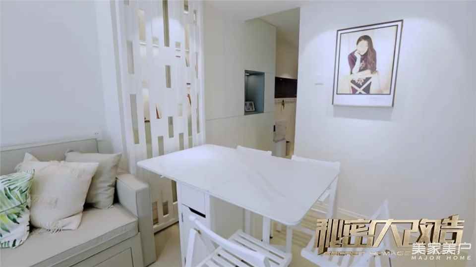 改造前,餐厅的餐桌靠墙摆设,物品堆积,待客就餐很不方便。改造后,设计师通过可活动屏风,实现玄关隔断和餐厅两种不同功能的切换。变形餐桌折叠起来可成为玄关柜,打开来就变成适合多人就餐的餐桌。