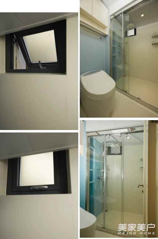 改造前,卫生间干湿不分离。采光不佳,白天需要开灯。改造后设计师通过调整次卧门的位置,利用原有过道空间将卫生间进行三区分隔,使洗漱区、如厕区和淋浴区相互独立,并且每个区域都有相应储物空间。