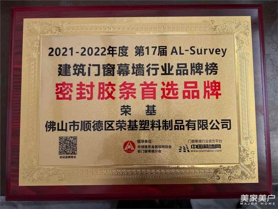 荣基胶条应邀出席本次大会,并从众多入围品牌中,夺得2021-2022年度第17届AL-Survey建筑门窗幕墙行业品牌榜“密封胶条首选品牌”大奖。