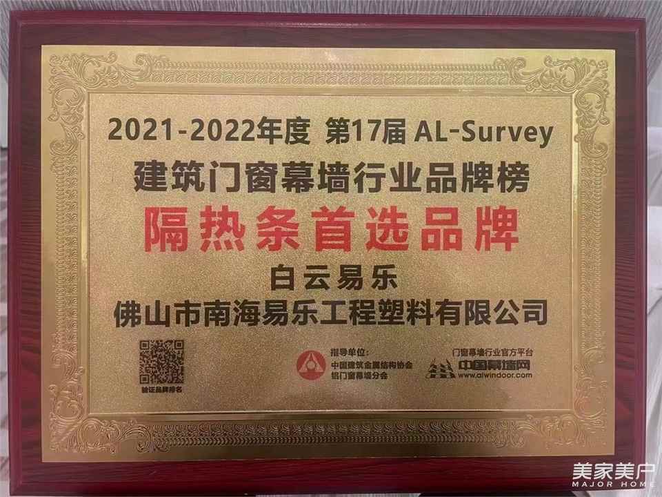 白云易乐深耕市场二十二载,凭借多年技术沉淀,高质量高性价比的产品,周到细致的配套服务等,从众多的参选者脱颖而出,喜获“隔热条首选品牌”!