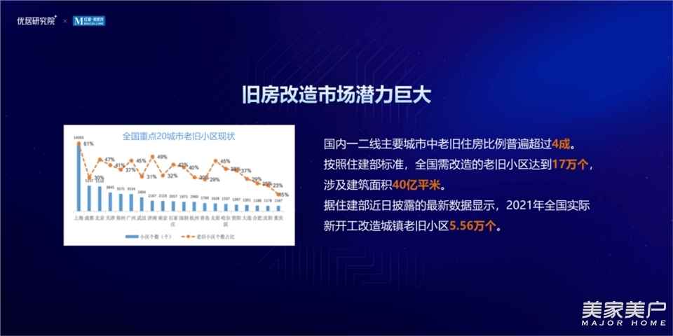 与其相关的旧房改造,国内一二线城市老旧住房比例超过四成,按照住建部标准需要改造老旧小区将近17万个,涉及到建筑面积40亿平方米。