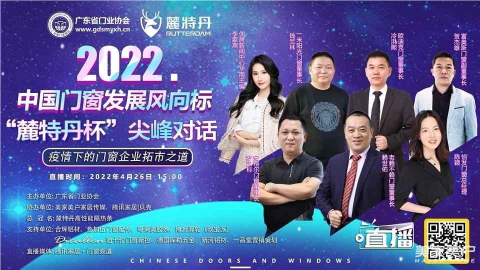 4月26日,由广东省门业协会主办,腾讯家居、美家美户家居协办的第6期线上直播对话活动在广州市荔湾区珠江钢琴创梦园(大歌局)举行。本次直播活动由“麓特丹高性能隔热条”总冠名,并得到合辉铝材、叁加伍门窗配件、粤莱美胶条、博升滑轮(欧宝派)、DICALLEN迪卡伦门窗新控、德国库勒五金、新河铝材、一品堂营销策划的大力支持。