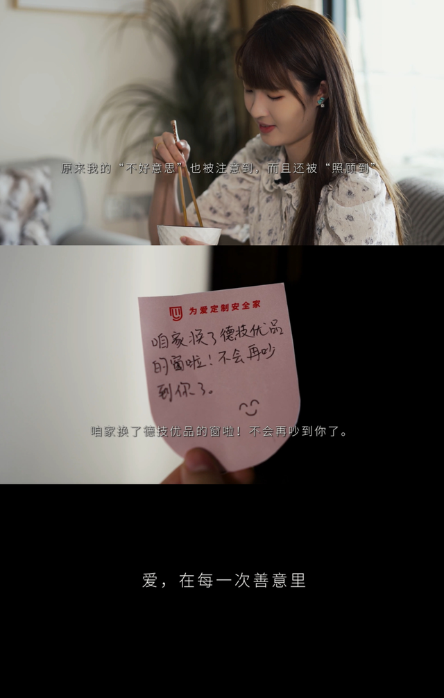 德技优品门窗推出“爱的留言”系列温情短片,用五个简单又日常的小场景,分别向观众讲述生活中的温暖瞬间。生活给我们带来的不只有疲惫和失落,更多的是感动与心安。