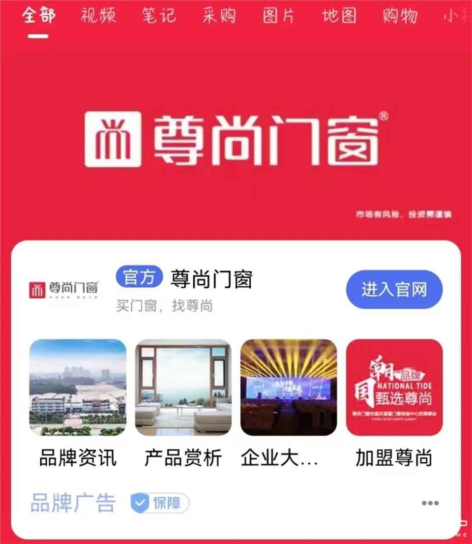 尊尚门窗每年品牌投放大力度投放百度推广,实现全媒体广告投放,与百度达成VIP战略合作,上线百度品牌专区获得更多品牌流量加持,赋能终端助力签单。