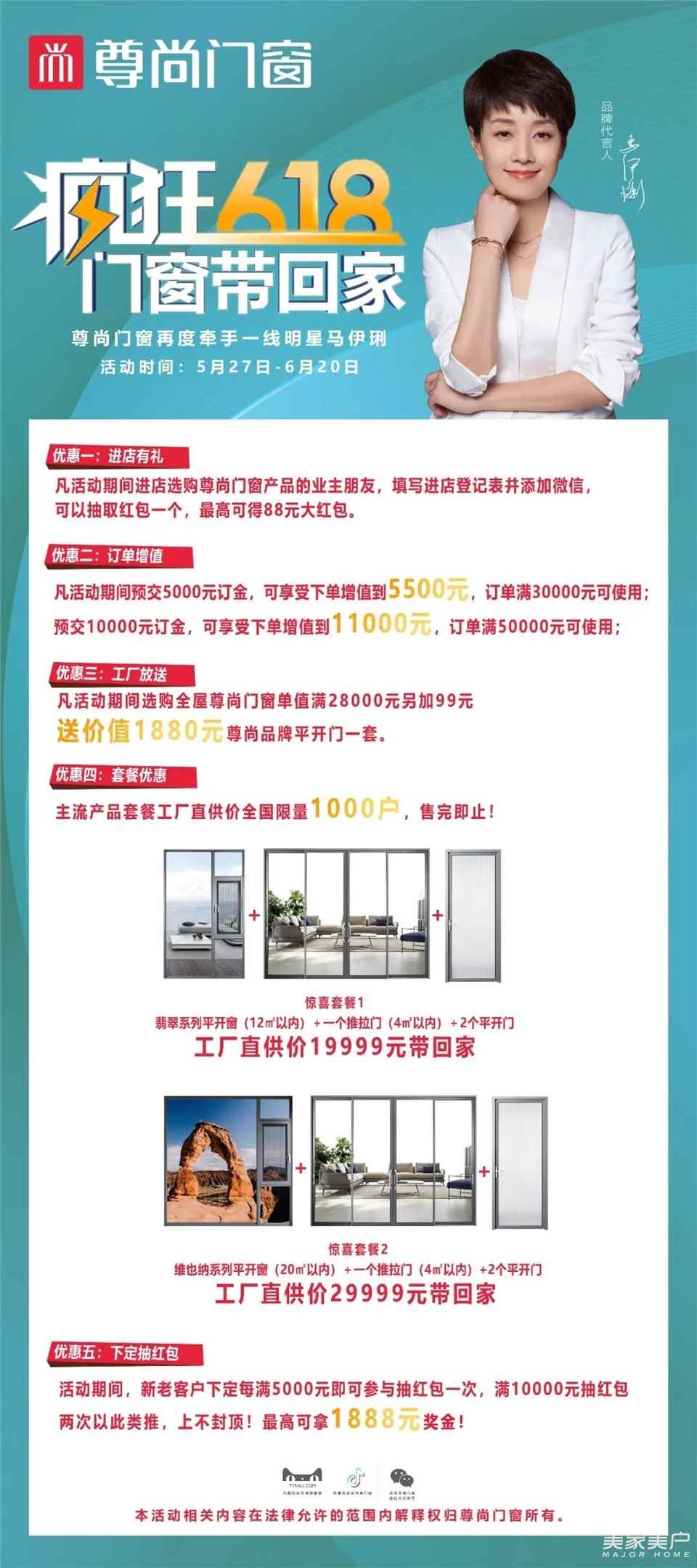 凡活动期间选购全屋尊尚门窗单值满28000元另加99元送价值1880元尊尚品牌平开门一套,主流产品套餐工厂直供价全国限量1000户,售完即止。“疯狂618,门窗带回家”尊尚门窗携手一线明星马伊琍618直播季即将开始,更多优惠政策,锁定28日下午15:00点直播间,敬请期待!