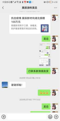 2020年1月26日,作为中国涂料行业第一家站出来为湖北疫区捐款的涂料企业,展辰新材紧急向湖北省红十字会捐赠人民币100万元,用于口罩、消毒液、防护服装等医疗用品的采购。当时武汉疫情的进展状况,让亿万人民忧心如焚,展辰新材表示一直保持高度关切,及时成立了疫情防控领导小组,号召国内外所有员工积极遵守各国各级政府各项防控政策以及卫建委的各项要求,并积极行动起来为抗击疫情贡献一份力量。而当时,全国工商联家具装饰业商会也联合主流媒体给展辰做过系列报道。