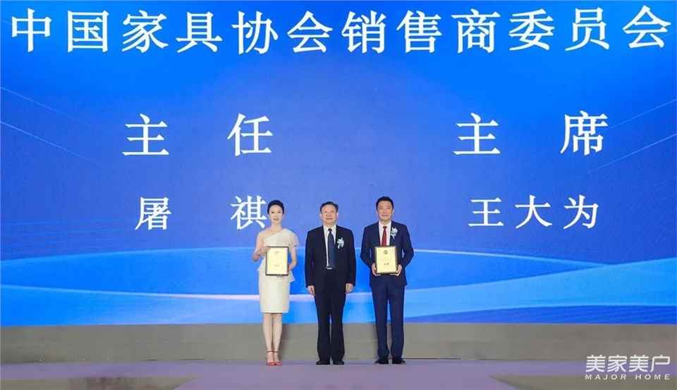 中国家具协会理事长徐祥楠为中国家具协会副理事长兼秘书长、销售商委员会主任屠祺和中国家具协会副理事长、克拉斯国际家居有限公司董事长、销售商委员会主席王大为颁发主任和主席牌匾。