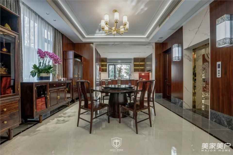 餐厅是家人情感的重要链接之处,沿袭了客厅沉稳的色调搭配,一捧向日葵点缀其中,为空间注入一股明媚。可旋转的圆桌配置,体现了中国人骨子里团圆就餐的温度与礼序。