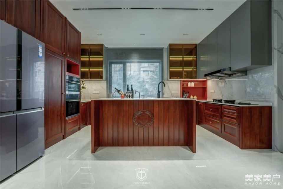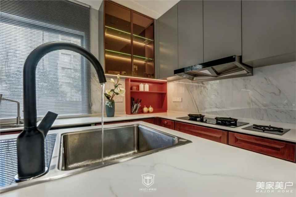 厨房布局合理,遵循洗、切、烹的厨房设计原则,整体动线合理清晰。上下双层橱柜设计,提供了大容量的储物空间。厨房空间不堆砌奢华,对称的布局、精美的线条,无不展示着现代厨房的意境之美。