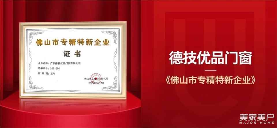 去年,德技优品门窗便荣获由佛山市工业和信息化局颁布的“佛山市专精特新企业”称号,以企业实力和卓越品牌力量,将“专精特新”落到实处,获得行业及市场的高度肯定。