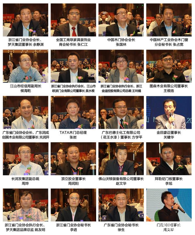 浙江省门业协会会长、梦天集团董事长余静渊,全国工商联家具装饰业商会秘书长张仁江,中国木门协会会长张国林,中国林产工业协会木门窗分会秘书长张占宽,江山市经信局副局长候海乾,浙江省门业协会执行会长、江山市欧派门业有限公司董事长吴水根,浙江省门业协会执行会长、浙江金迪控股有限公司总裁王玲娟,图森木业有限公司董事长王维扬,广东省门业协会会长、广东润成创展木业有限公司董事长关润开,TATA木门总经理张岩,泉州嘉森木业有限公司副总经理李健,广东巴德士化工有限公司(花王水漆)董事长方学平,金田豪迈木业机械有限公司董事长关键华,长润发集团副总裁周烨,顶立胶业董事长周闰阳,佛山沃顿装备有限公司董事长赵文华,拜勒尼门板董事长李旭,浙江省门业协会执行会长、梦天集团品牌总监姚友明,浙江省门业协会秘书长李进,广东省门业协会秘书长徐生,四川省门窗业协会秘书长余龙鹏,福建省门窗商会秘书长夏理勇,南京移门行业协会秘书长何建国,武义门业协会秘书长汤华治,浙江王力门业有限公司总经理郑钢,浙江王牌门业有限公司董事长何利明,浙江开洋门业有限公司董事长毛庆德,浙江金凯门业有限公司董事长陈江富,门配100理事长周文华,中山市海诗蔓五金董事长韩军等600多位门窗产业链上下游企业家齐聚江山,共同探讨行业发展大计。