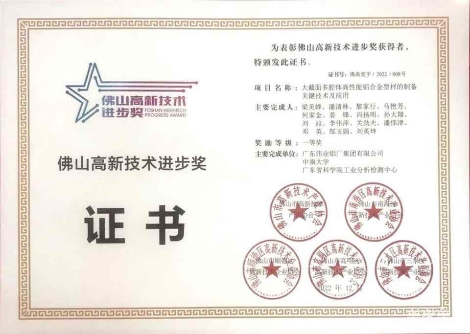 作为从南海成长发展的铝型材企业,伟业始终把“科技兴伟业 质量创名牌”的理念摆在首位,创新力、智造力、绿色力成为伟业发展的核心组成部分,推动伟业铝材30年来行稳致远,屡创佳绩。由伟业、中南大学、广东省科学院工业分析检测中心完成的“大截面多腔体高性能铝合金型材的制备关键技术及应用”获第四届佛山高新技术进步奖一等奖,且相关核心技术已推广应用到伟业铝材多款工业型材产品中,为轨道交通、新能源汽车、机械装备提供轻量化高性能铝应用解决方案。