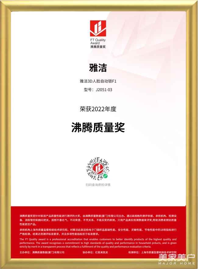 由中国质量认证中心指导,沸腾质量数据主办的2022年度沸腾质量奖圆满落幕,雅洁五金凭借过硬的品质和精湛的技术创新实力,在国内众多家居品牌重脱颖而出,参评的3D人脸识别智能锁F1荣获2022年度“沸腾质量奖”。