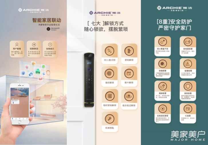 在门锁智能品质方面,雅洁智能锁F1从研发至成品历经无数道工序精细打磨和层层严苛的检验流程,品质优良。采用最新的3D人脸识别技术,身高在1.3~1.9m、距离在0.25~1米范围内都能识别得到人脸,大人小孩的需求同时能满足;也无需担心夜间昏暗的环境无法开门,夜间能自动补光,搭载鸿蒙系统,与家里的智能设别联动,出门回家都很安心,并且拥有人脸、密码、指纹、刷卡、临时密码、组合验证和钥匙七大解锁方式,满足全家人的多样化解锁需求,除此之外,还能设置专属开锁有效时段,有客到访或家政服务都很方便。在智能安防方面,智能锁F1涵盖抗小黑盒干扰、低电量告警、试错告警、防撬告警等8重安全防护,时刻守护家的安全。