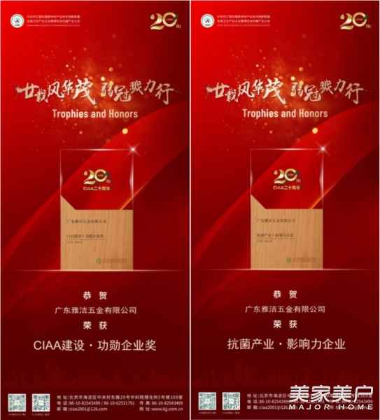 携手共进,续写荣光!雅洁五金荣获“CIAA建设·功勋企业奖”和“抗菌产业·影响力企业奖”