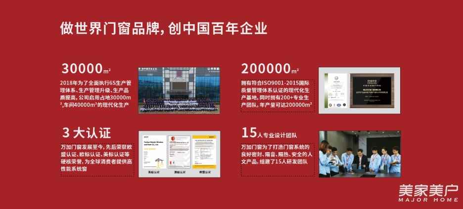 万加门窗拥有符合ISO9001-2015国际质量管理体系认证,先后荣获欧盟认证、欧标认证、美标认证等荣誉,拥有现代化生产基地总建筑面积30000多平方米,能以高品质,快速度完成交付!