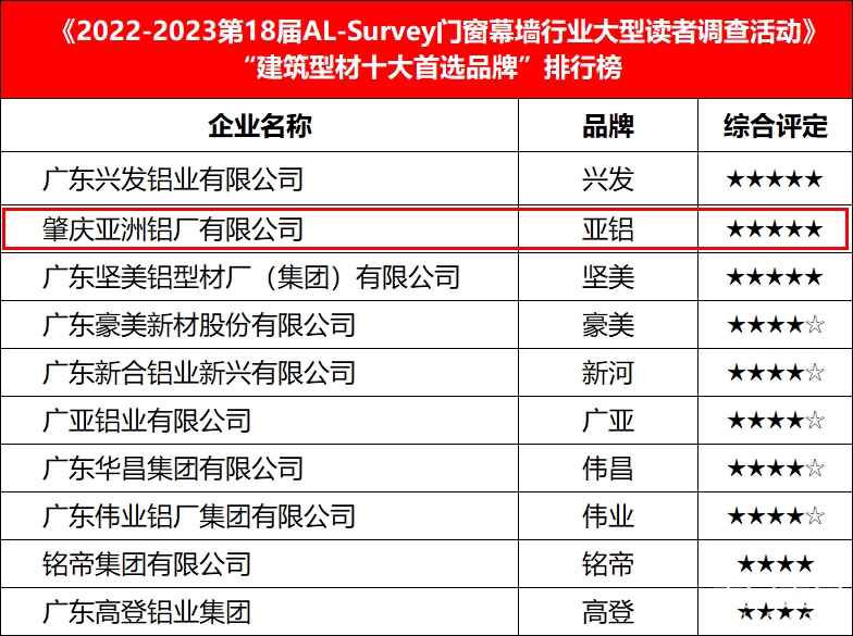 没有黑马,AAG亚铝上榜2023第18届门窗幕墙行业首选品牌