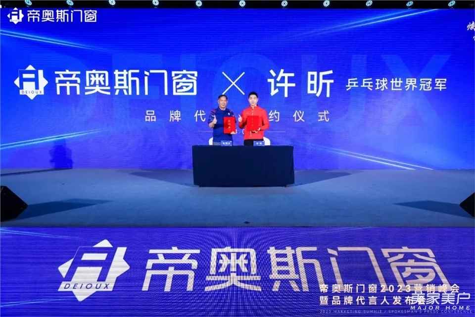 3月31日,帝奥斯2023年营销峰会暨品牌形象代言人签约仪式在佛山·保利洲际酒店隆重举行。本次峰会以“焕昕启程,帝造未来”为主题。帝奥斯不仅成功签约世界兵乒球冠军许昕为品牌形象代言人,还荣任广东省门业协会常务副会长单位。