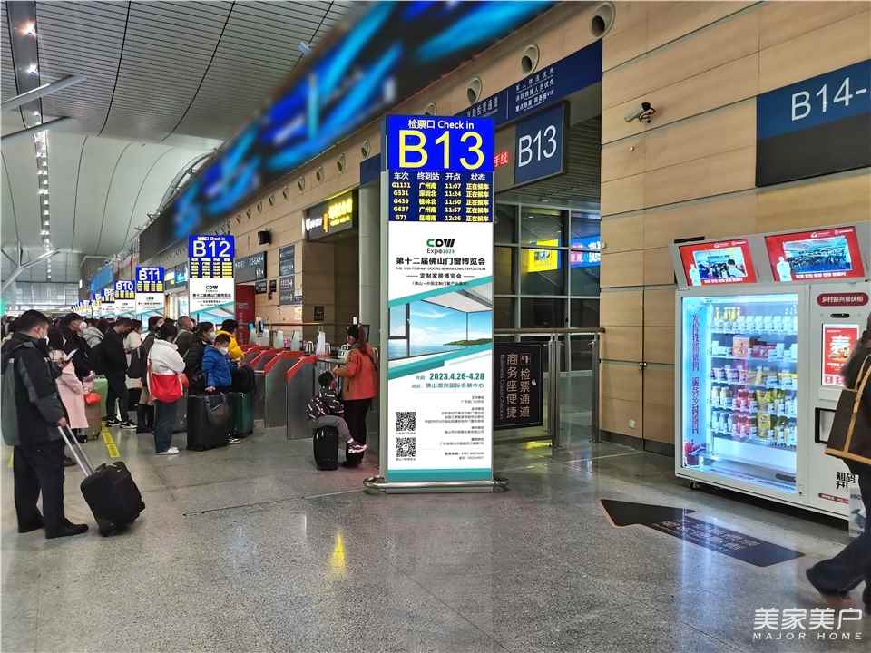 此次广告投放,分布在长沙高铁南站到达、出发层等人流量密集的位置,广告位多达96个,通过高铁站广告核心资源大范围传播方式,提高出入站旅客与第十二届佛山门窗博览会的接触频率,实现出入站人群的100%密集覆盖。