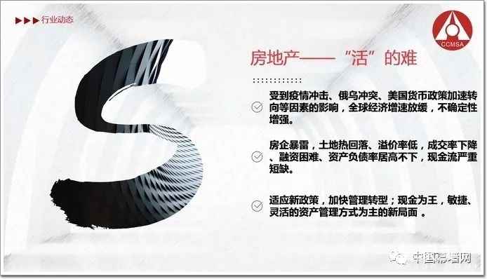 今年,受到疫情冲击、俄乌冲突、美国货币政策加速转向等因素的影响,全球经济增速放缓,不确定性增强。根据国际货币基金组织的预测,今年中国的国内生产总值增长率会放缓。面对这样的宏观形势,房地产业需以“活”字当头。房地产行业虽然政策放宽,但总体恢复依旧较为缓慢,寒潮已现,房地产业下滑明显,百强房企同期业绩下滑20%以上,多家知名房企陆续暴雷,大大降低了市场内对房地产业的信心;土地热地回落明显,溢价率低,成交率下降;虽受政策端持续放宽房地产融资影响,房企的融资成本有所下降,但资产负债率居高不下,现金流严重短缺现象非常明显。现阶段房地产企业最重要的是去库存、促回款,主要通过降价、分销、现房销售、线上营销等手段来实现。