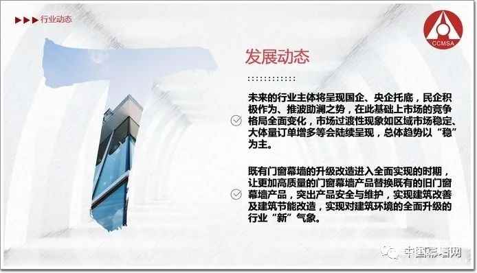 当然,更离不开让既有门窗幕墙的升级改造进入全面实现的时期,让更加高质量的门窗幕墙产品替换既有的旧门窗幕墙产品,突出产品安全与维护,实现建筑改善及建筑节能改造,实现对建筑环境的全面升级的行业“新”气象。