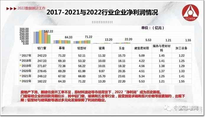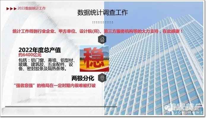 我国铝门窗幕墙行业2022年度总产值6400亿元左右,以房地产与建筑业服务为主体的行业企业利润率进一步下滑,不良资产率增加,尤其是幕墙门窗工程企业,今年在面对主要原材料涨价、融资困难、回款难且周期长等因素影响下,现金流十分紧张,经营现状较为糟糕。