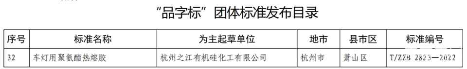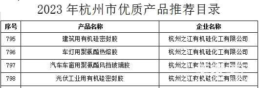 近日,杭州市经济和信息化局印发《2023年杭州市优质产品推荐目录》的通知,之江有机硅公司的四类主导产品:建筑用有机硅密封胶、车灯用聚氨酯热熔胶、汽车车窗用聚氨酯风挡玻璃胶和光伏工业用有机硅密封胶,进推荐目录。