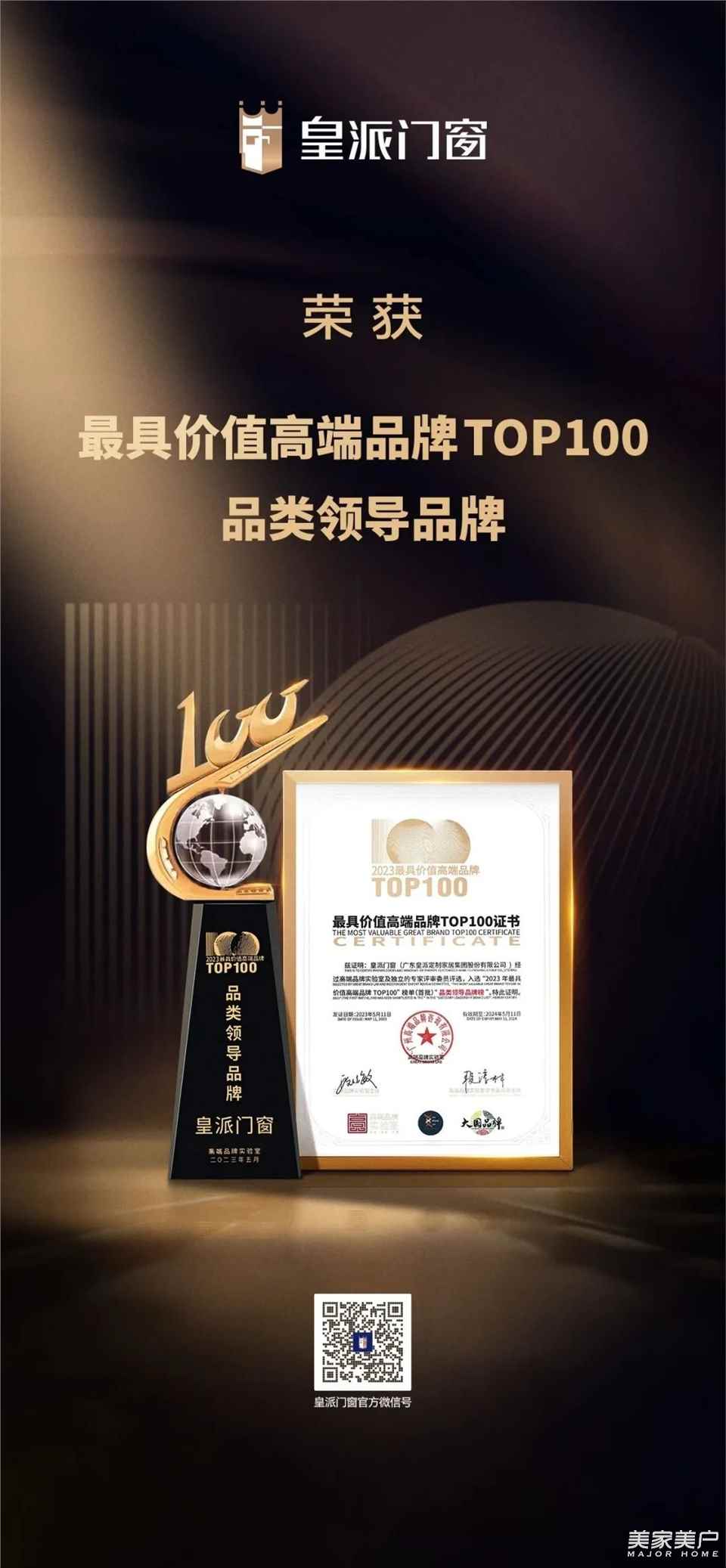 品牌价值再攀高峰 | 皇派门窗荣获最具价值高端品牌TOP100「品类领导品牌」