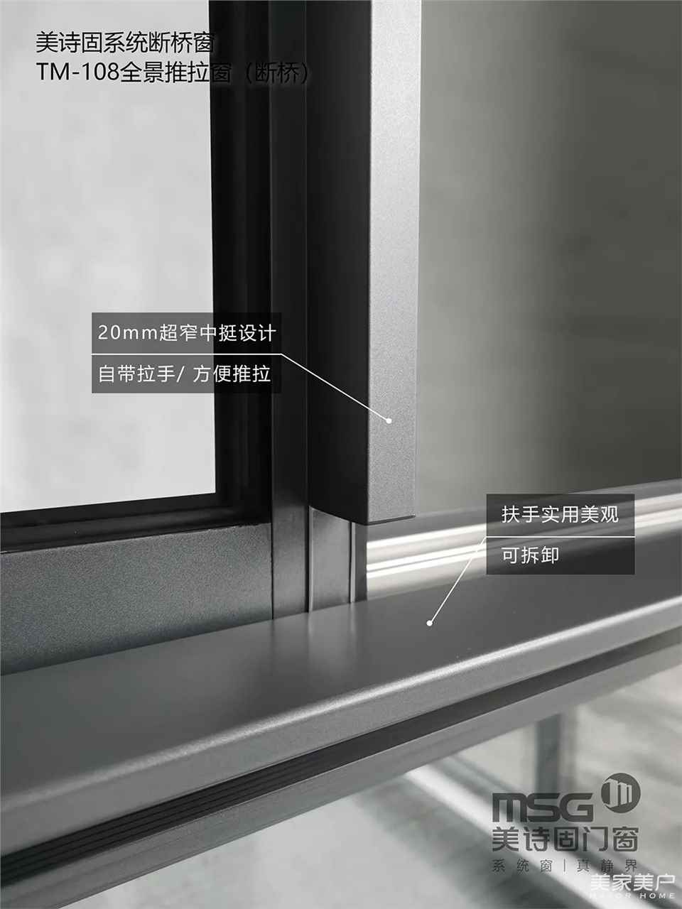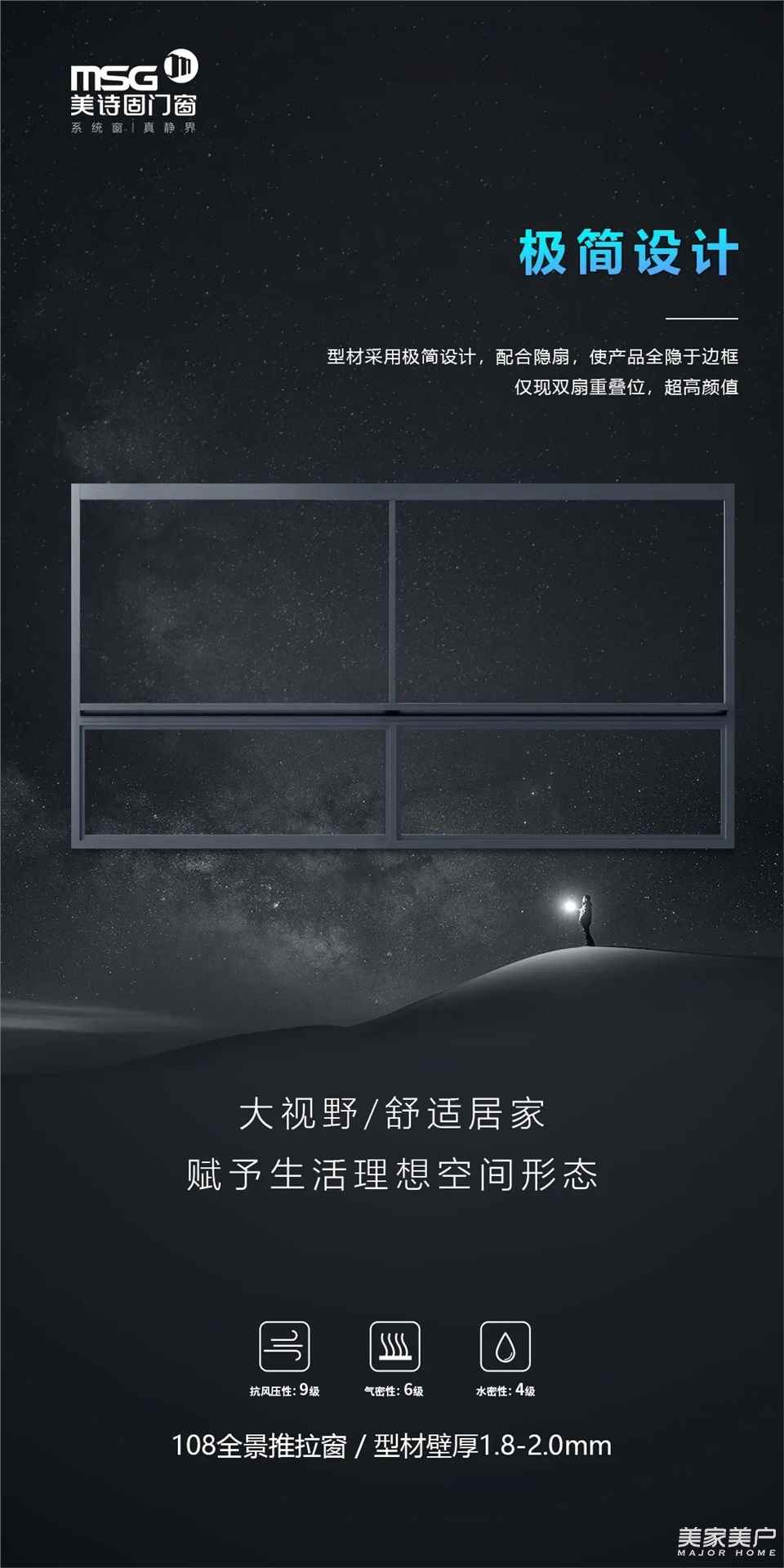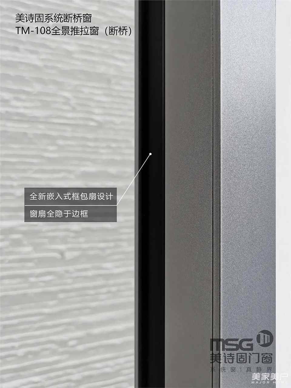 美诗固TM108全景极简断桥推拉窗设计理念是围绕“大视野”和“舒适居家享受”两个关键词,在有限空间内构造无限对生活的美好想象,在保证安全的基础上,构造超大视野,让门窗融入建筑中。