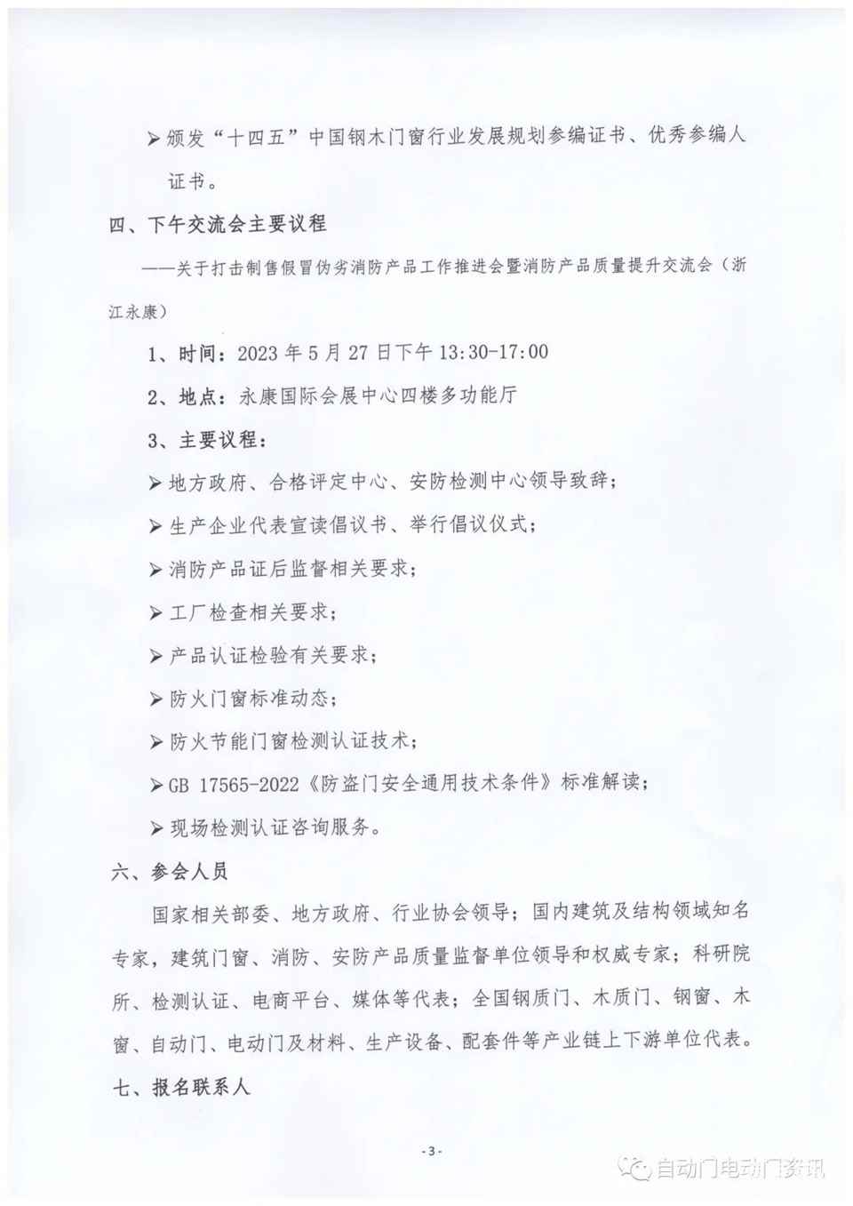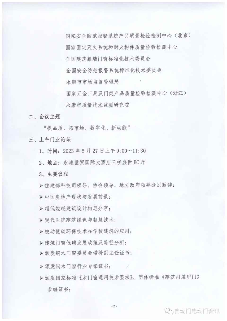 为全面贯彻落实中共中央、国务院《质量强国发展纲要》战略要求,统筹推进质量安全和品牌建设,培育中国钢木门窗行业技术、标准、品牌、质量、服务为核心的新优势,促进行业全产业链安全健康、绿色低碳和高质量发展,经研究,决定在第13届中国(永康)国际门业博览会期间,举办第六届中国门业创新发展论坛暨消防产品质量提升交流会,特邀政府部门、行业协会、科研院校、检测认证机构、专业用户等单位的领导和专家,与知名企业一起共同解读国家相关产业政策、研讨行业创新思路及发展趋势。相关事宜如下: