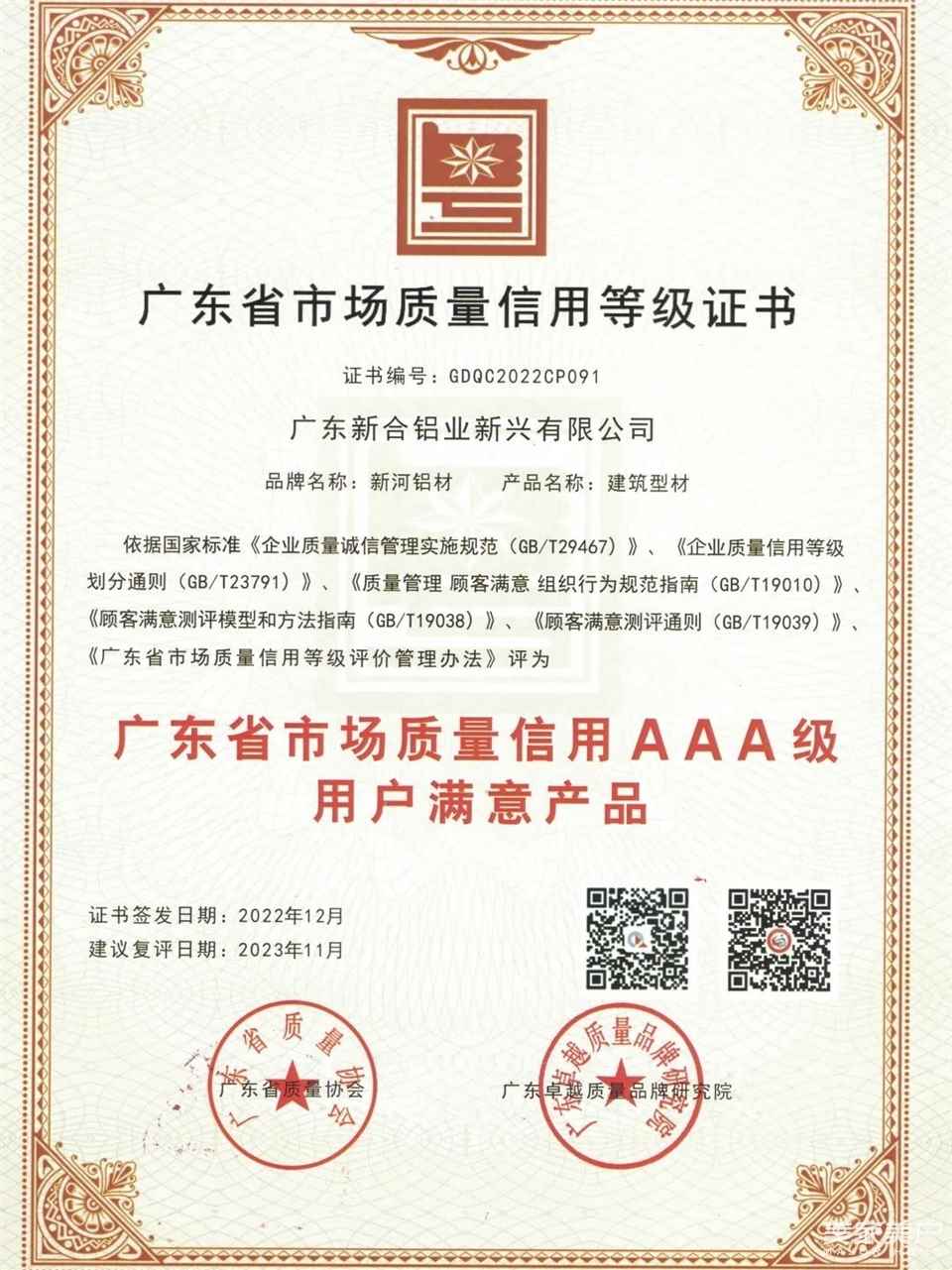 2023年2月,广东省质量协会、广东卓越质量品牌研究院颁发了《关于2022年广东省市场质量信用A等(用户满意)企业名单的通报》,新河建筑型材凭借过硬质量被评为“2022年广东省市场质量信用等级AAA级用户满意产品”。
