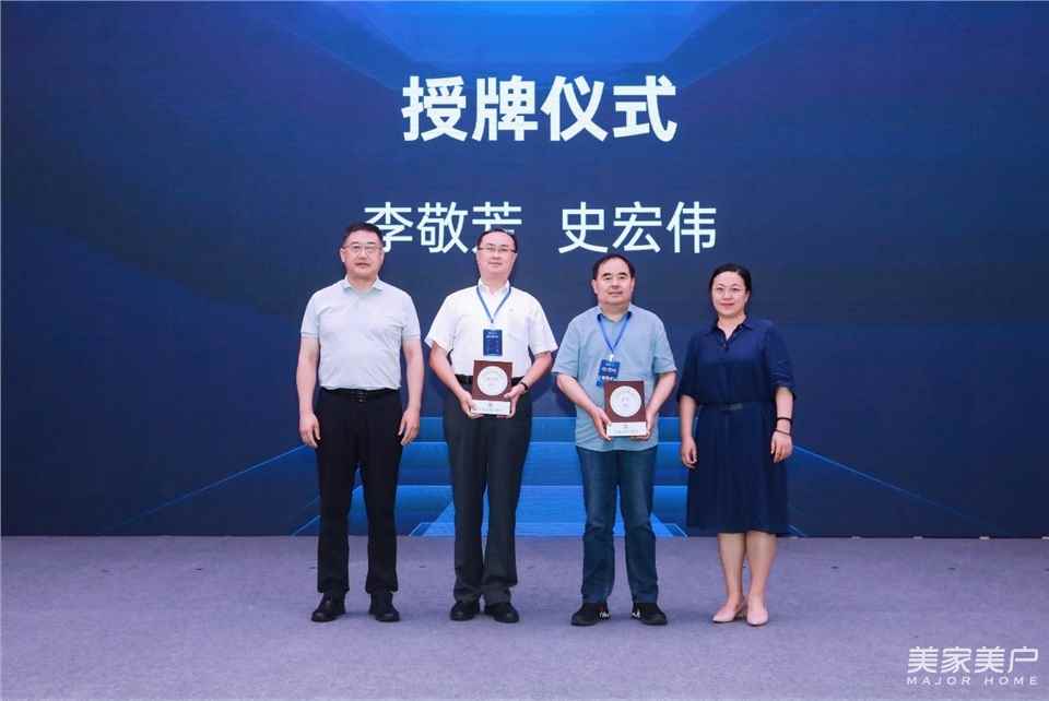 全联房地产商会秦晶副秘书长和边东昱副秘书长为全联房地产商会节能门窗分会会监事长、亚萨合莱国强(山东)五金科技有限公司总经理李敬芳和为全联房地产商会节能门窗分会执行监事长、天津新艾隆科技有限公司董事长史宏伟授牌。