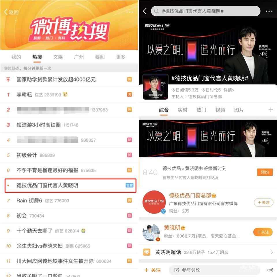 6月13日凌晨,词条“德技优品门窗代言人黄晓明”迅速登上微博热搜前十,而后德技优品门窗公众号、视频号、小红书、抖音全媒体平台紧跟其后官宣了这一消息,由此正式拉开德技优品门窗品牌升级序幕。