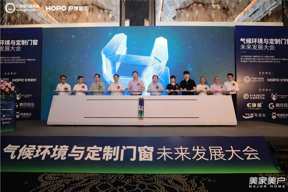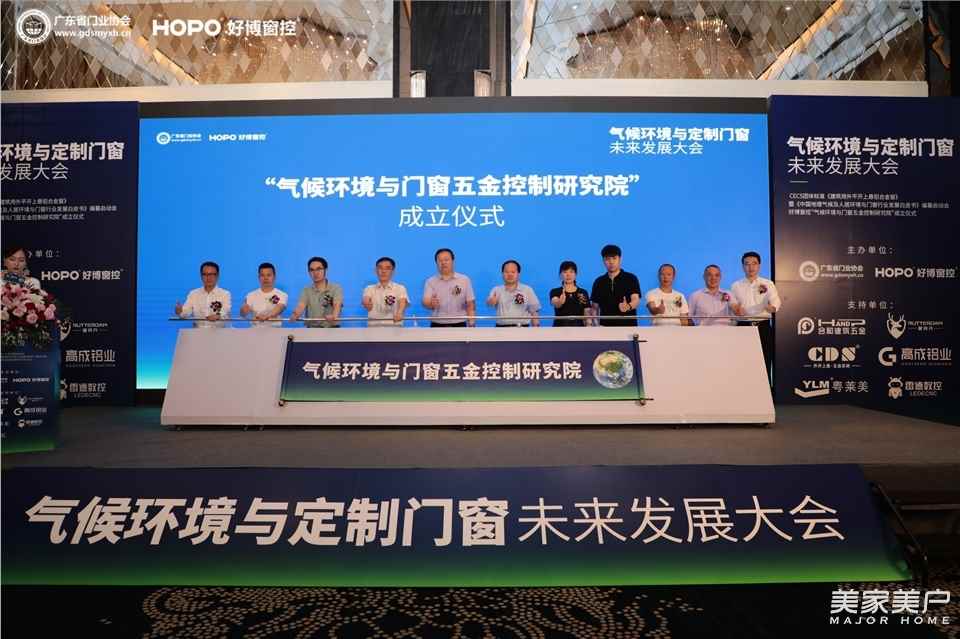 全国建筑幕墙门窗标准化技术委员会秘书长王洪涛、副秘书长刘会涛,国家气候中心高级专家张思齐,山东建筑大学建筑门窗与幕墙研究所所长阎玉芹,好博窗控董事长李增榜,广东省门业协会执行会长徐生,好博窗控产品中心总经理刘治国,新豪轩门窗总裁冯佐星,美之选门窗董事长徐锦荣,老赖不赖门窗董事长莱赖世佑,德技优品门窗董事长雷少军共同上台,参加了“气候环境与门窗五金控制研究院”启动仪式。
