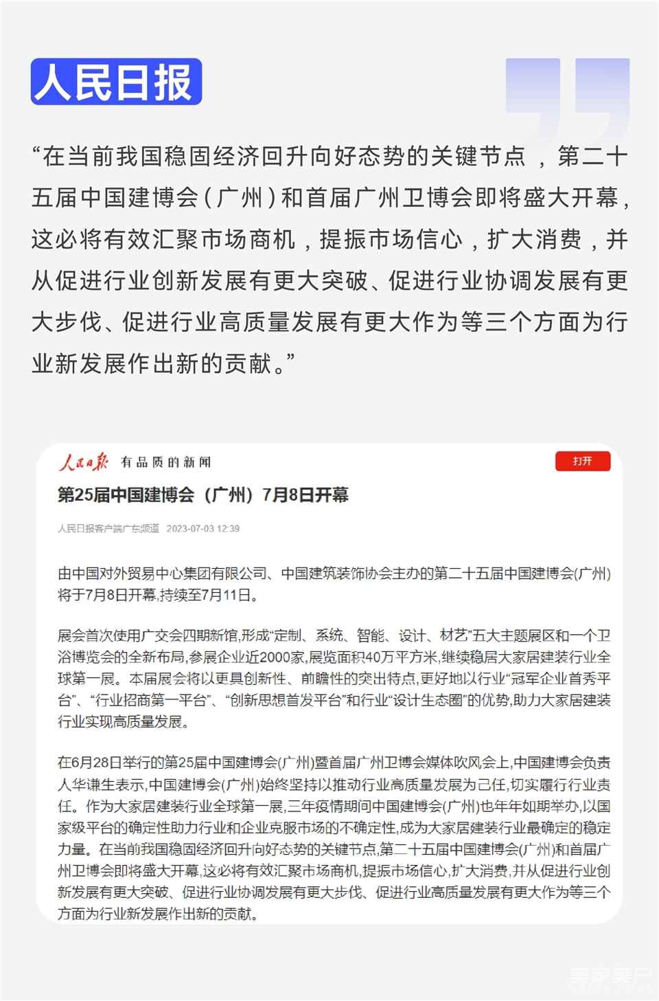 第25届中国建博会(广州)和首届广州卫博会积极响应6月29日国务院常务会议审议通过的《关于促进家居消费的若干措施》,持续深化展会主题,以更具创新性、前瞻性的突出特点,引领大家居建装行业高质量发展。在我国经济持续回升向好、全国各地加快高质量发展的关键节点,本届展会的成功举办,全面呈现了大家居建装行业强劲的复苏态势,起到了有效汇聚市场商机、提振市场信心、扩大市场消费的积极作用,并从促进行业创新发展有更大突破、促进行业协调发展有更大步伐、促进行业高质量发展有更大作为三个方面为行业新发展作出了新的贡献。