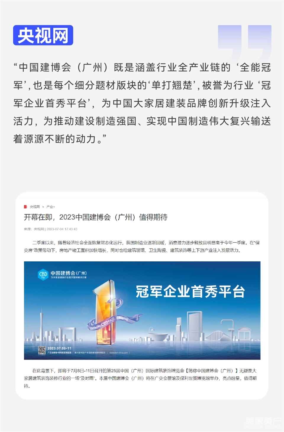 7月8日下午,2023中国建博会(广州)主论坛——“中国大家居建装行业高质量发展大会”在广州成功举办。