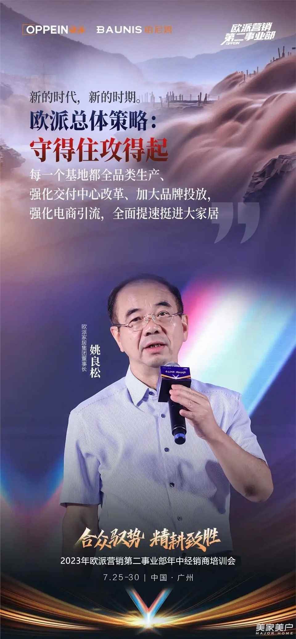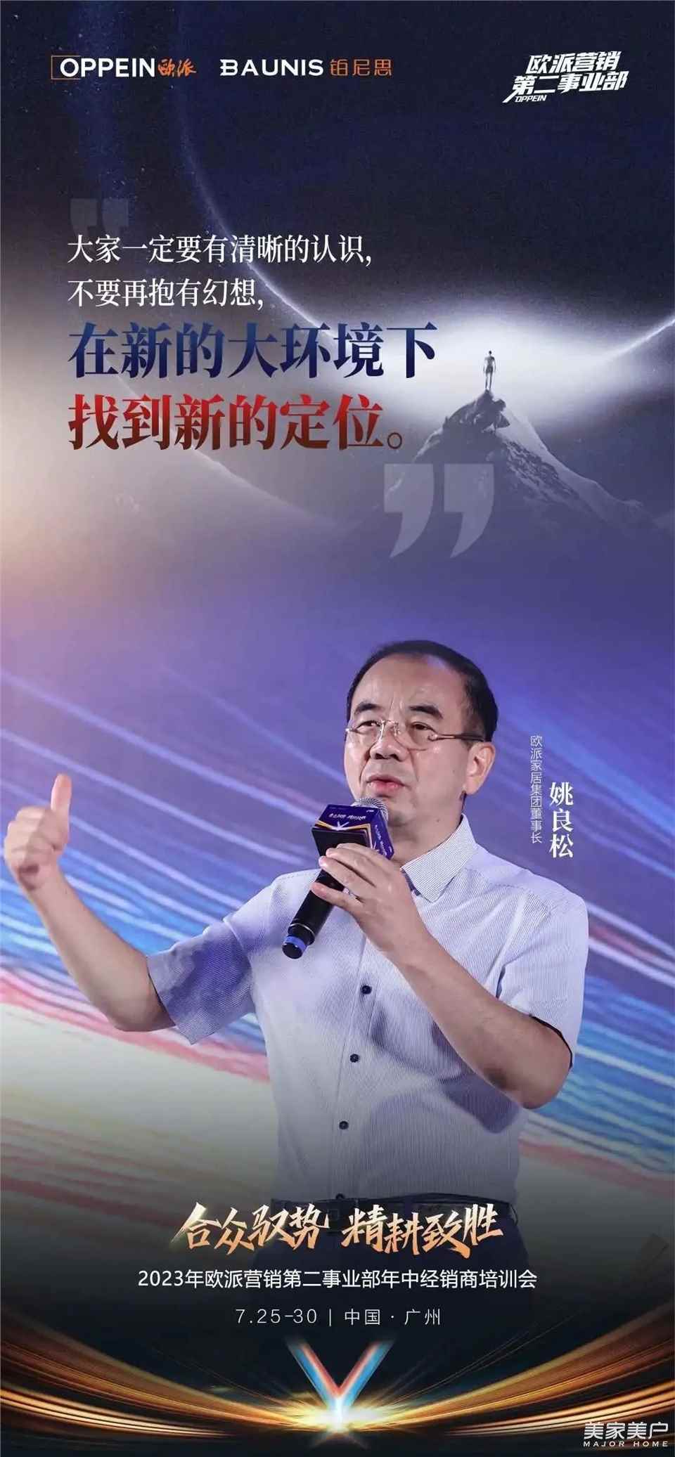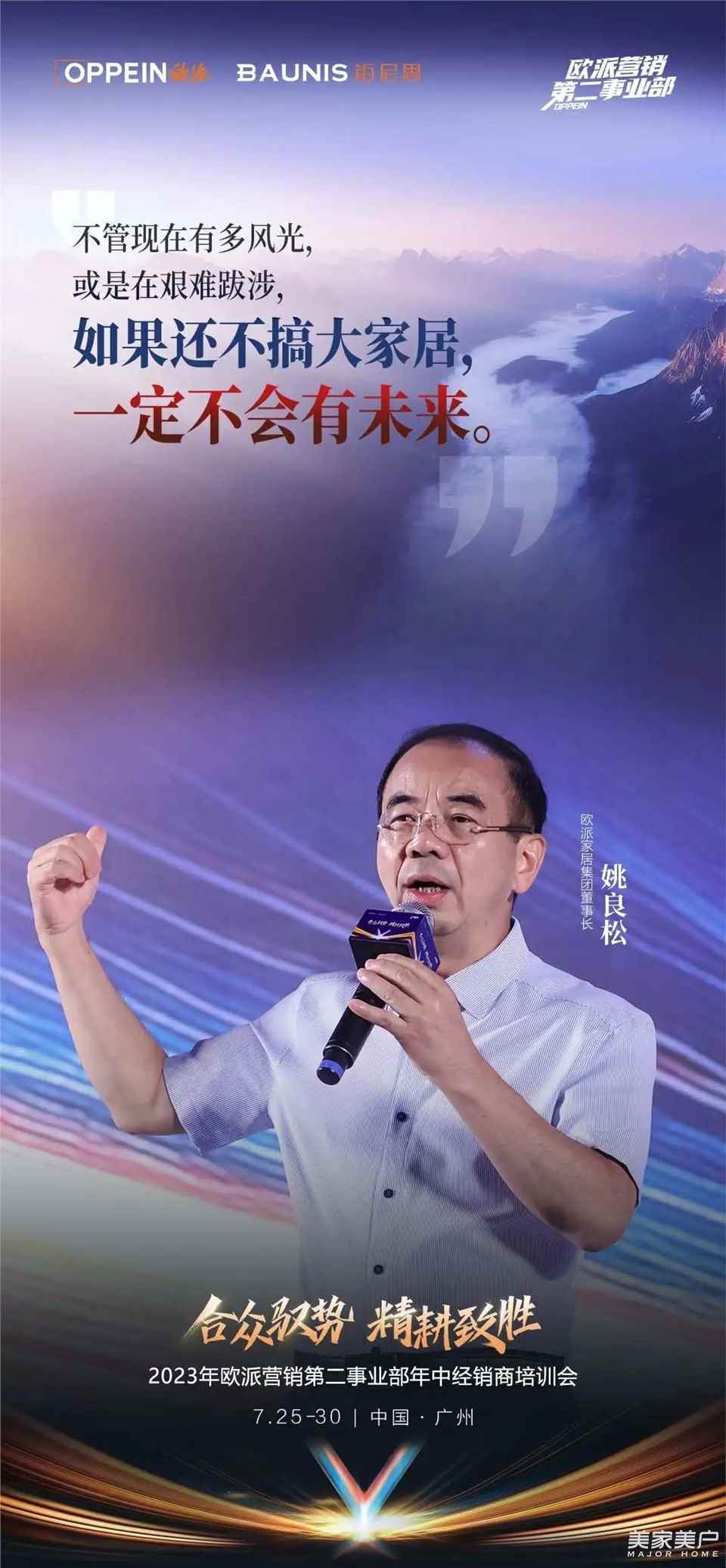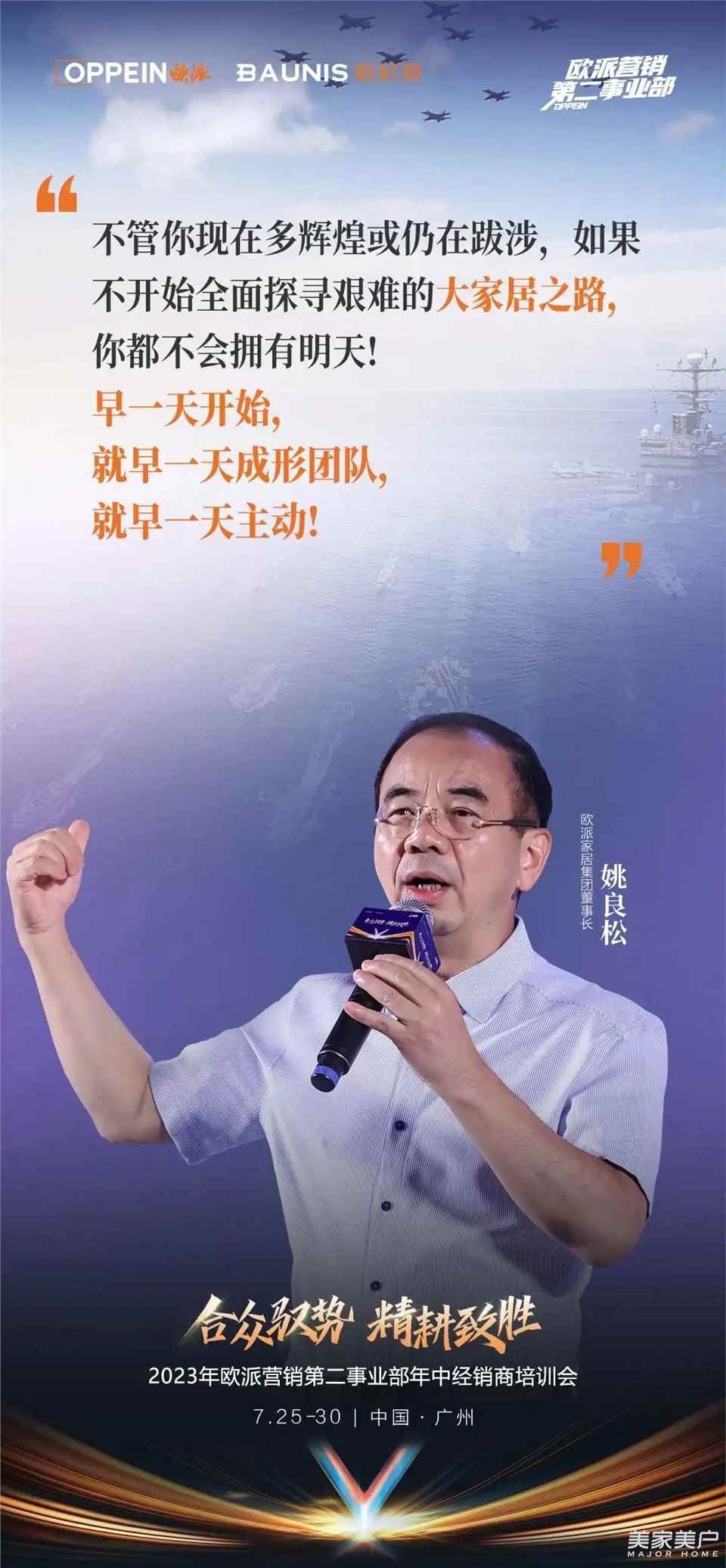 近日,在“合众驭势 精耕致胜”——2023年欧派营销第二事业部年中经销商培训会上,欧派家居集团董事长姚良松金句频频,以前瞻性的眼光敏锐洞察家居行业的深度变化,适时做出了经营策略调整,对大家居、多品类以及对市场趋势做出了预判,姚良松高屋建瓴,寥寥数句,振聋发聩。
