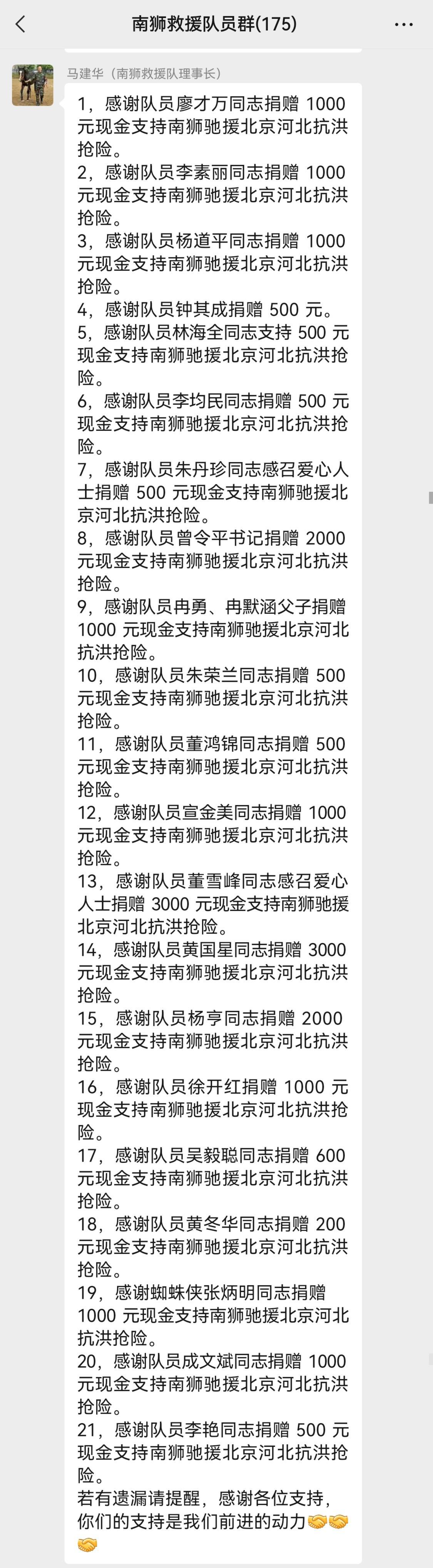 此外,不少队员还踊跃捐款捐物。其中,队员羊梦杰表示,他不仅要去救人,还决定带一批灾区需要的发电机过去,完成救灾任务后将捐赠给当地应急部门。而不少队员也纷纷慷慨解囊,从数百元到3000元不等,以爱心捐款的方式支持南狮救援队组织救援队伍前往涿州救灾。