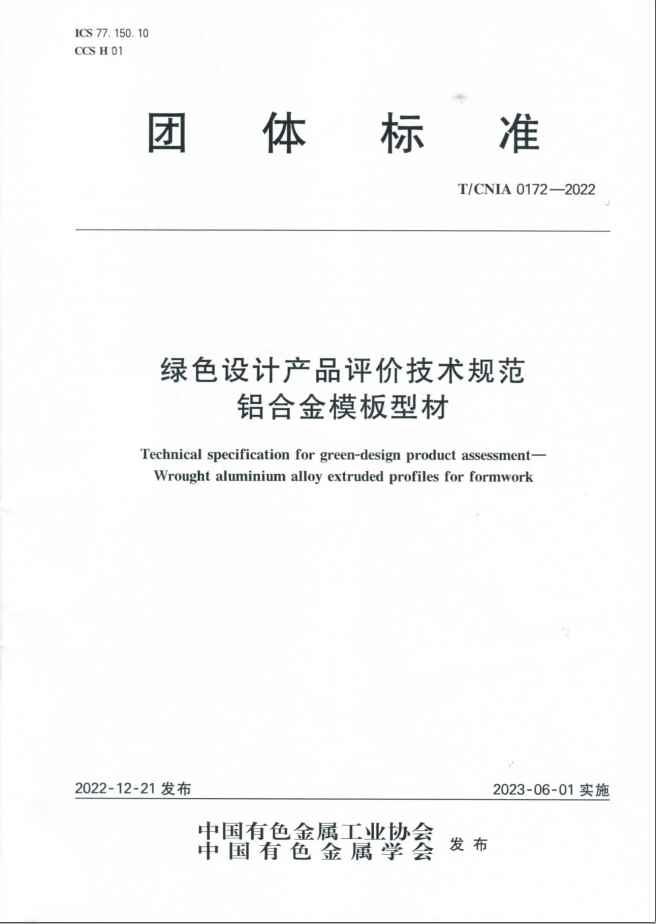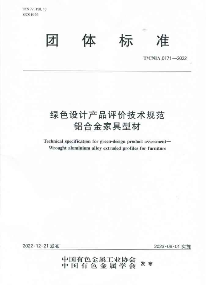 在广东伟业铝厂集团有限公司牵头制定的《绿色设计产品评价规范——铝合金家具型材》(T/CNIA 0171-2022)、《绿色设计产品评价技术规范——铝合金模板型材》(T/CNIA 0172-2022)两项团体标准中,规定了铝合金家具型材与铝合金模板型材的绿色设计产品评价的基本要求、评价指标要求以及产品生命周期评价报告的编制方法和评价方法。标准从资源属性、能源属性和产品属性等多个方面对铝合金家具型材与铝合金模板型材的评价指标进行了规定。