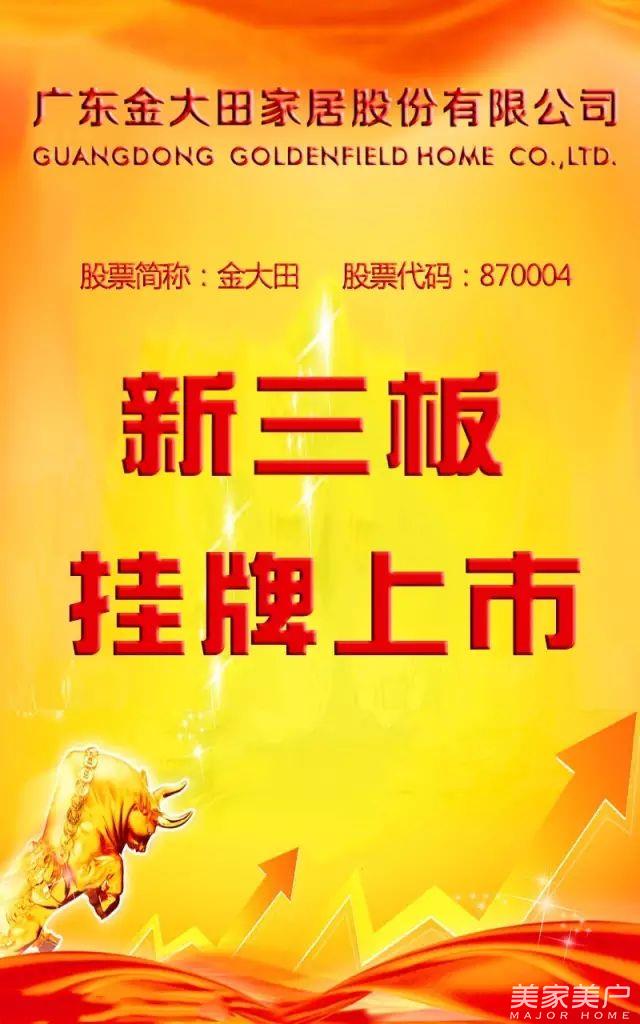十八年砥砺奋进,今天荣耀绽放!2016年11月15日,广东金大田家居股份有限公司(股票简称:金大田,股票代码:870004)在新三板成功挂牌!这是金大田发展中的重要里程碑,正式登陆资本市场的金大田将迈进新的发展阶段。