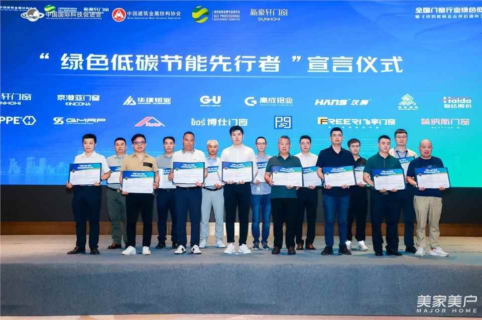 为推动门窗行业、家居建材行业、制造业乃至广大企业的绿色低碳行动,发挥行业头部企业先行者的力量和引领作用,现场包含新豪轩门窗、京港亚门窗、华建铝业、格屋贸易、高成铝业、汉狮光动科技、南海易乐工程、江阴海达橡塑、好博窗控、青岛美德橡塑、诺托弗朗克建筑五金、博仕门窗、派阁智能五金、飞宇门窗、简纳斯门窗、冠达新材料等在内的企业领导和代表,共同上台,发表“绿色低碳节能先行者”宣言。