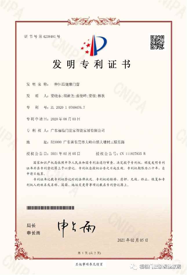福临门世家恒温健康门窗——集福临门世家制窗工艺的大成之作,在原有断桥铝门窗研发制造基础上,进一步升级产品技术,创新窗户品类,并通过国家专利局审查,荣获国家发明专利!